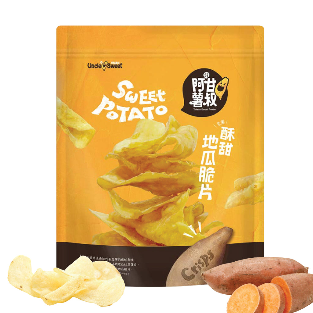 The product is Uncle Sweet Taiwan Sweet Potato Crisps (阿甘薯叔 酥脆甜地瓜脆片), a popular snack known for its delicious crunch and sweet potato flavor.