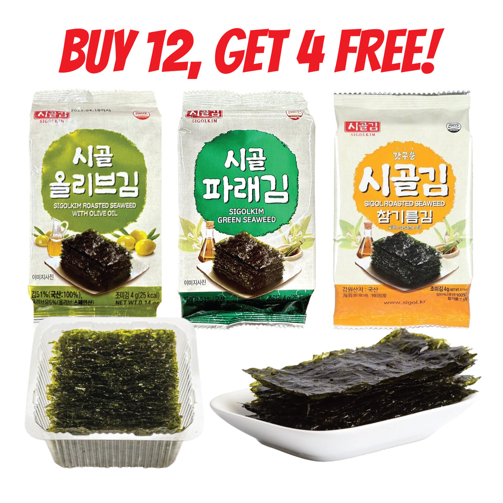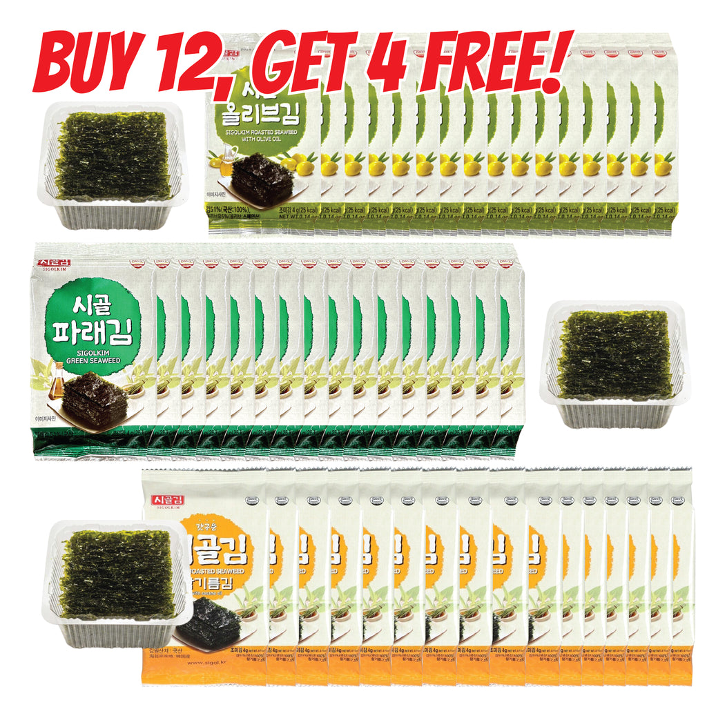 / Korean Crispy Seaweed Nori Snacks - Olive Oil, Sesame Oil, Green Flavor 12 + 4 FREE Packs