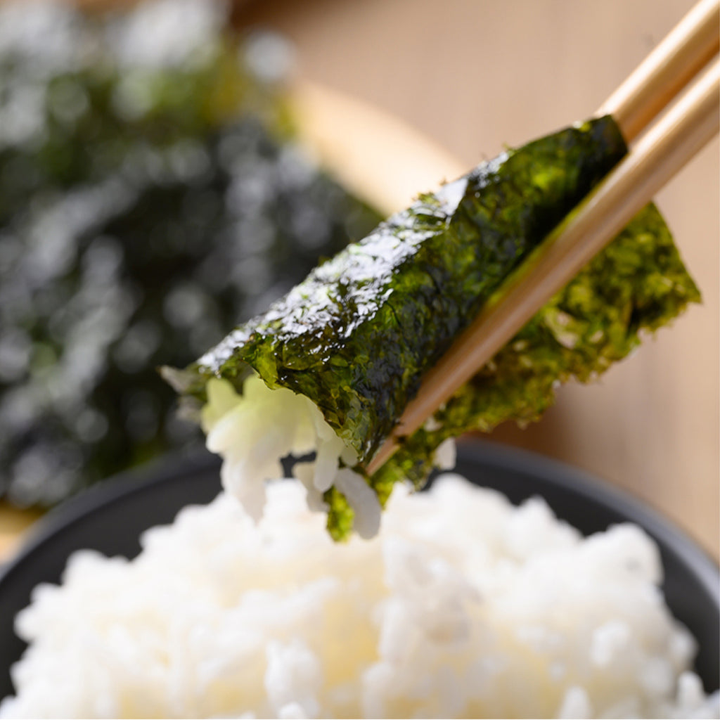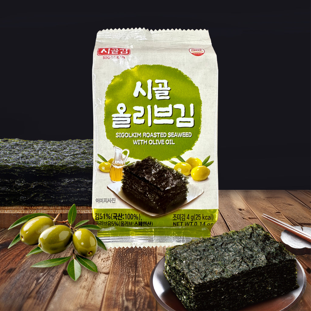 • Roasted with Olive Oil: Seasoned with savory oil (usually a blend including olive oil and/or sesame oil) and salt, giving it the classic umami flavor and a satisfying crispness.