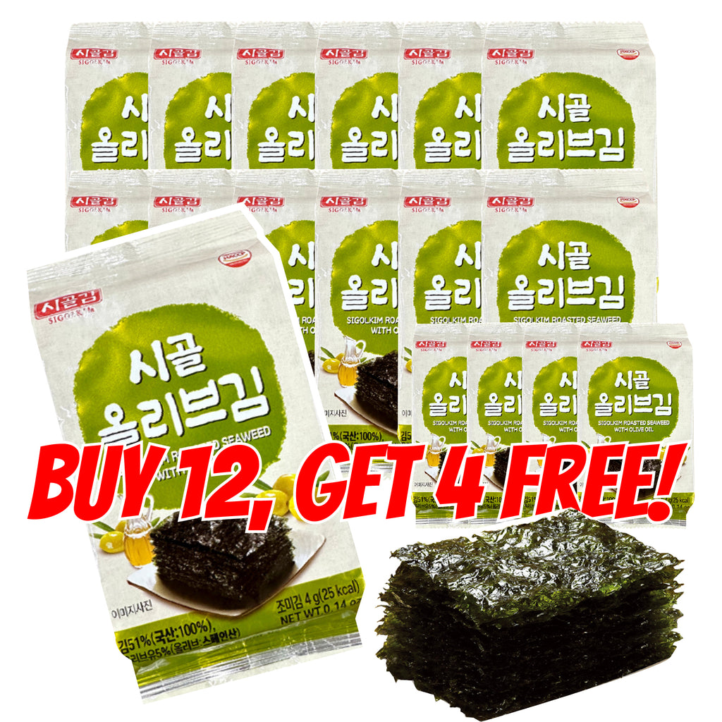 Sigolkim Green Seaweed (파래김) - Roasted Nori Snacks with Olive Oil (12 + 4 FREE Packs)